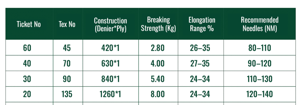 High melting point of above 260 °C prevent the thread from melting at the needle eye while sewing.